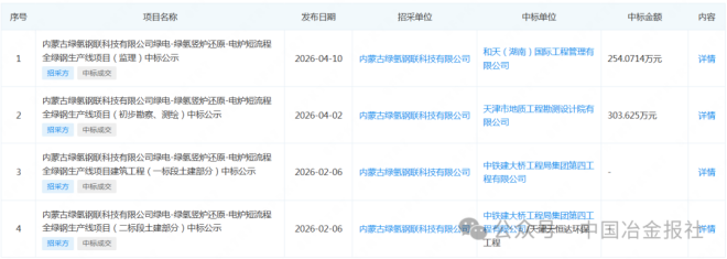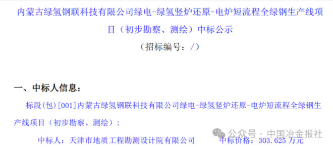 4月7日,內蒙古綠氫鋼聯科技有限公司綠電-綠氫豎爐還原-電爐短流程全綠鋼生產線項目初步勘察、測繪部分中標公示發布。